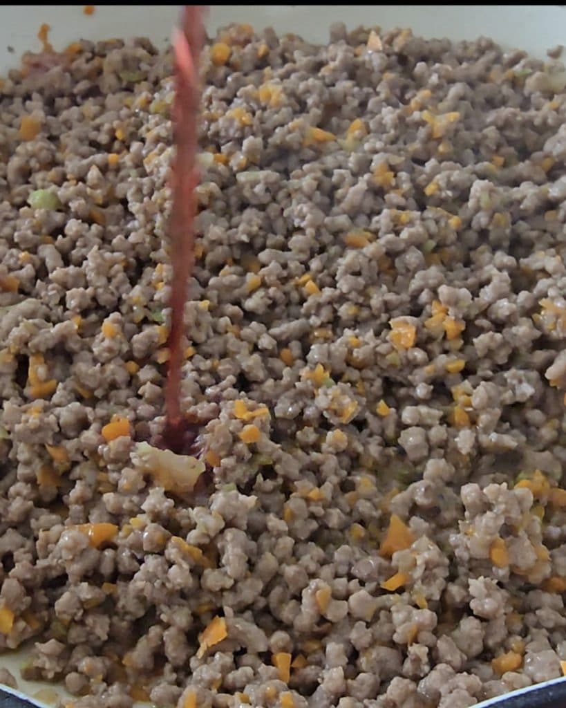 • Add the ground meat and cook for about 10 minutes, then season with salt and pepper.