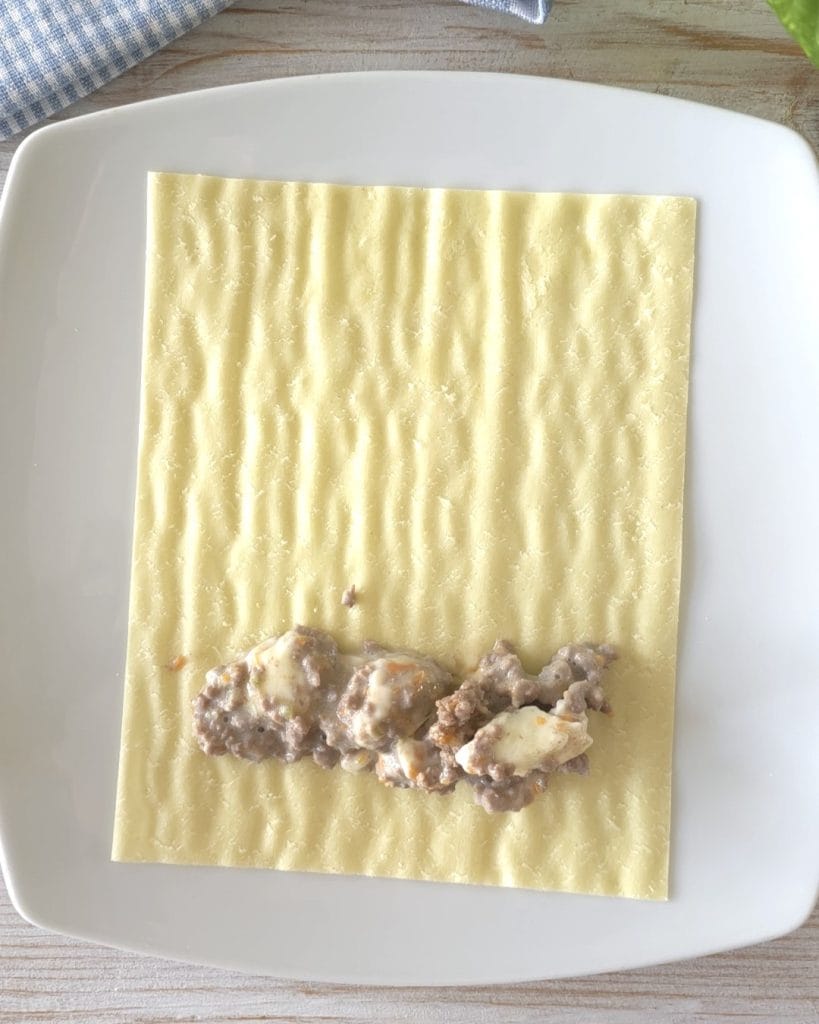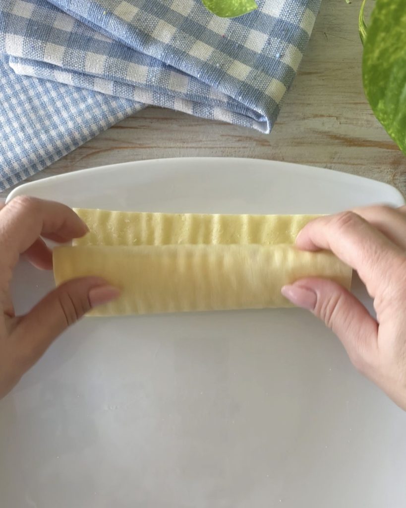 • Then roll up the pastry on itself to form cylinders. Spread a couple of tablespoons of béchamel sauce on the bottom of a baking dish and place your cannelloni