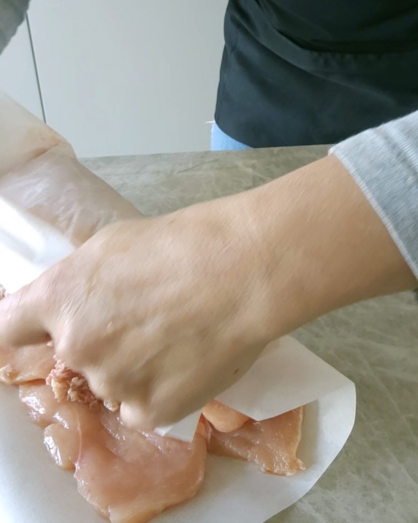 Arrange the slices of chicken next to each other, slightly overlapping, then pound the meat with a meat mallet to flatten it properly.