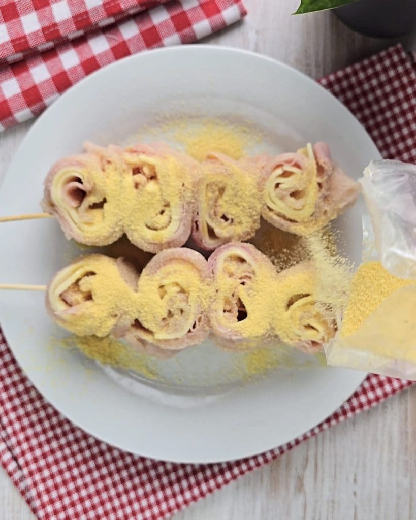 At this point, cut the already made rolls with a smooth blade knife, thus creating two finished skewers.