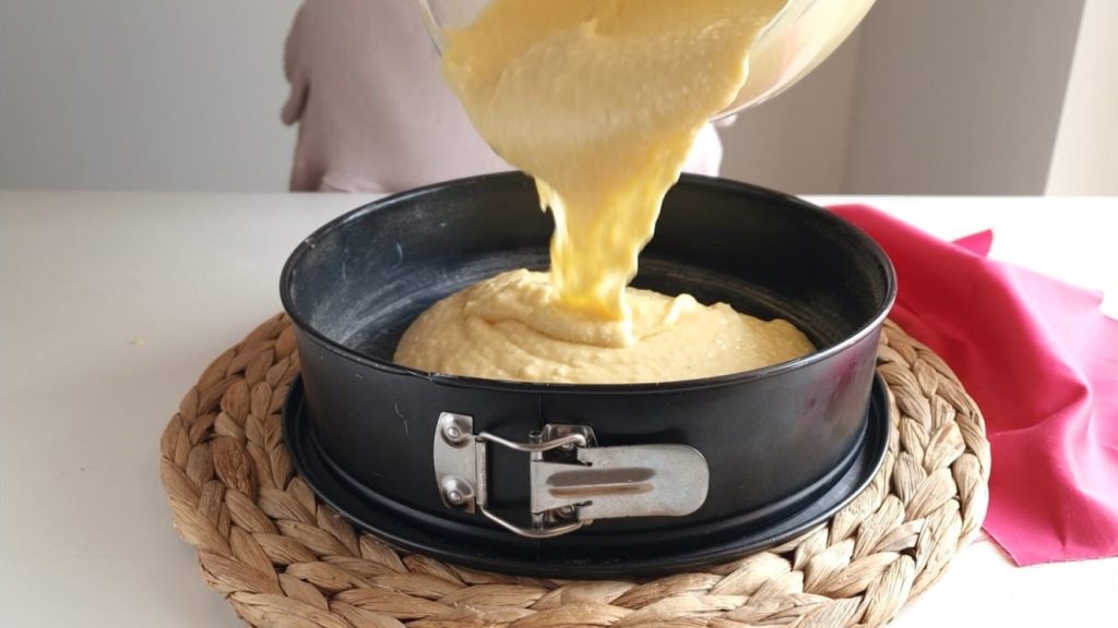 • Next, pour the mixture into a 10-inch pan, previously buttered and floured.