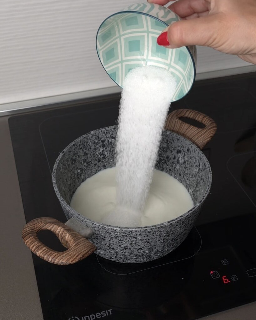 In a saucepan, put the sugar and milk, bringing it to a boil, then turn off the heat and add the sifted flour and continue to stir with a whisk.