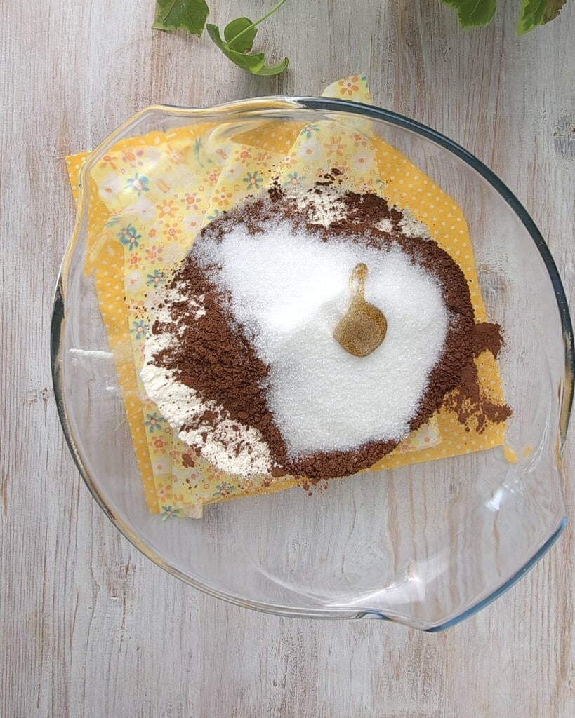 Prepare the dough as follows: In a bowl, mix the flour with cocoa, sugar, baking powder, and vanilla sugar, then add the diced butter and eggs.