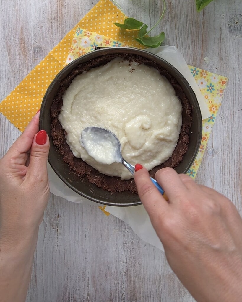 Pour the coconut cream and cover with the remaining crumbs, then bake for 35 minutes at 340°F in a static oven.
