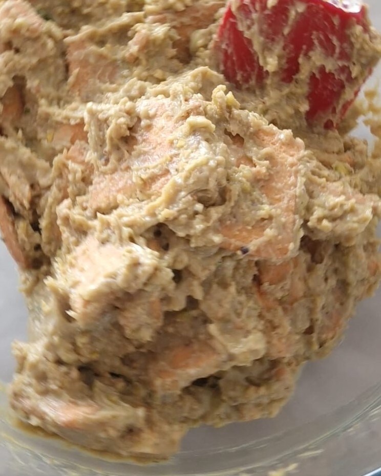 • Using a spatula, mix everything well to create a fairly uniform dough. Then pour the mixture into a previously lined 7-inch pan.