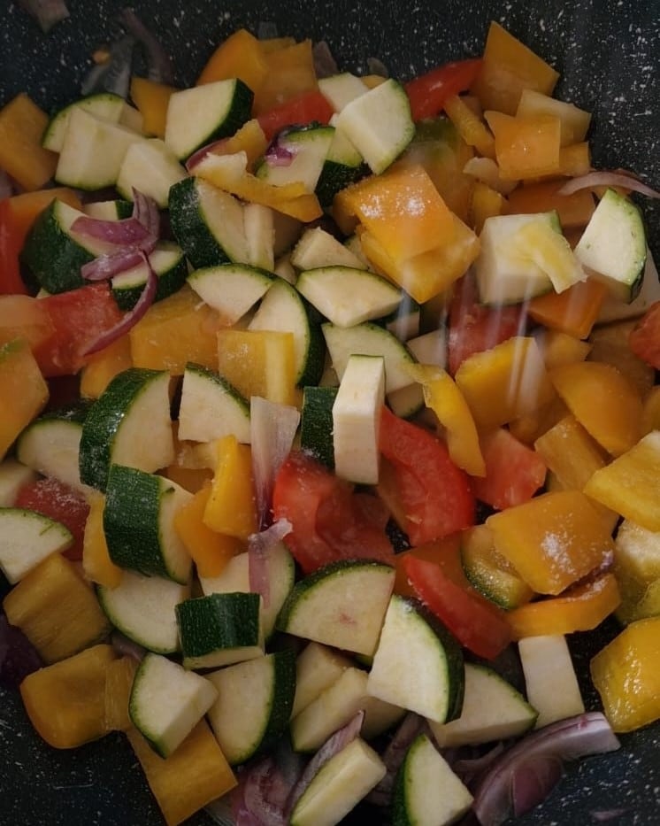 Cut the vegetables into pieces, then sauté them in a pan with the thinly sliced onion and a drizzle of extra virgin olive oil.