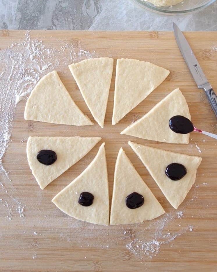 • At this point, divide the first disc into 8 triangles and fill each triangle with the jam, do the same with the second disc.