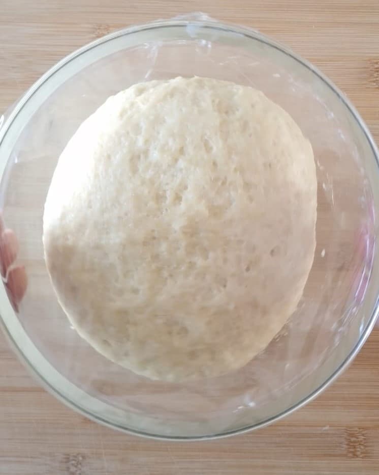 • Transfer the dough into a bowl, cover it with plastic wrap, and let it rise until doubled in volume, in the oven with just the light on, it will take about 2 hours.