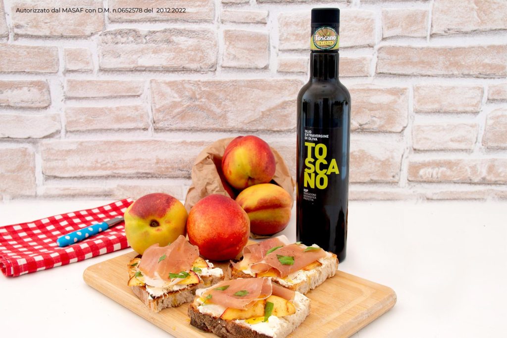 The crostini with goat cheese, peaches, and prosciutto are a quick appetizer perfect for a summer evening with friends. To make these simple steps, you need genuine ingredients like goat cheese, peaches, prosciutto, and the indispensable Tuscan IGP Extra Virgin Olive Oil to garnish everything. I’ve always used it; it can’t be missing in my kitchen. It enhances the flavor of my dishes: an unmistakable taste with fresh, vegetal notes of olive, ideal for making my dishes’ flavors stand out. If my recipe inspires you, follow me;