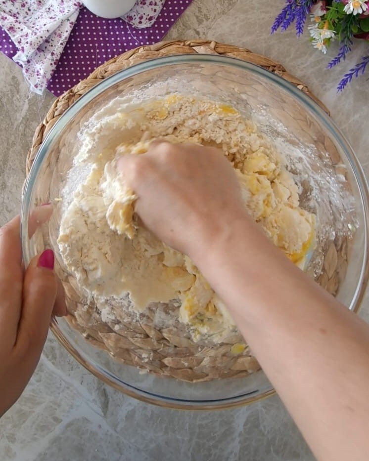 In a bowl, place the flour, butter cut into pieces, and baking powder, and quickly work it with the flour. Add the sugar, eggs, baking powder, and mix everything.