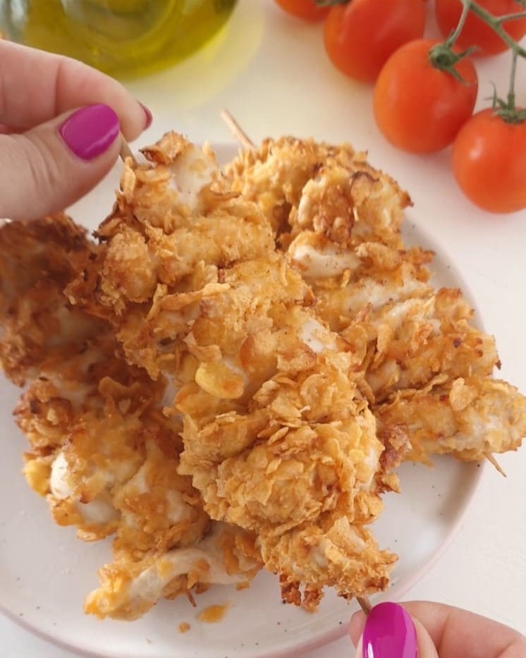 Crunchy Chicken Skewers are delicious! The chicken breast stays tender and flavorful inside, but crunchy outside thanks to the tasty cornflakes coating. I’ve also made oven-baked chicken skewers and pork skewers with potatoes. Today’s recipe is light, healthy, and very quick to make, go ahead and prepare the recipe!