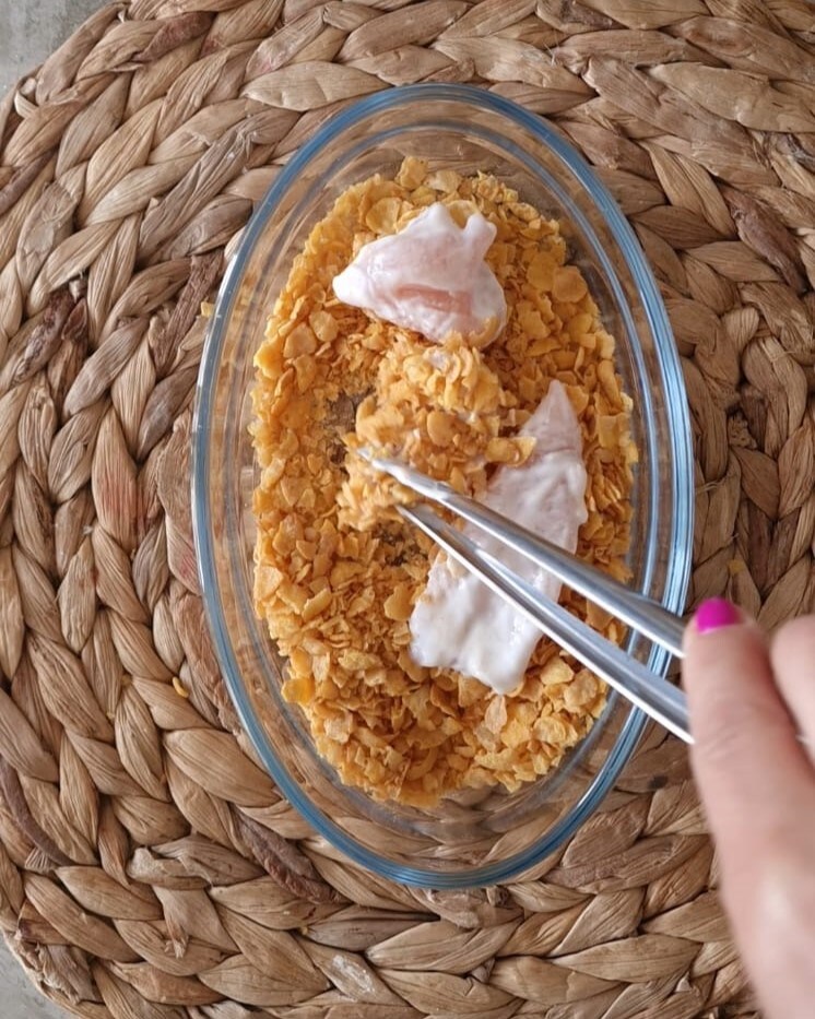 After resting time, take the chicken cubes and coat them in corn flakes, roughly crushed with your hands.