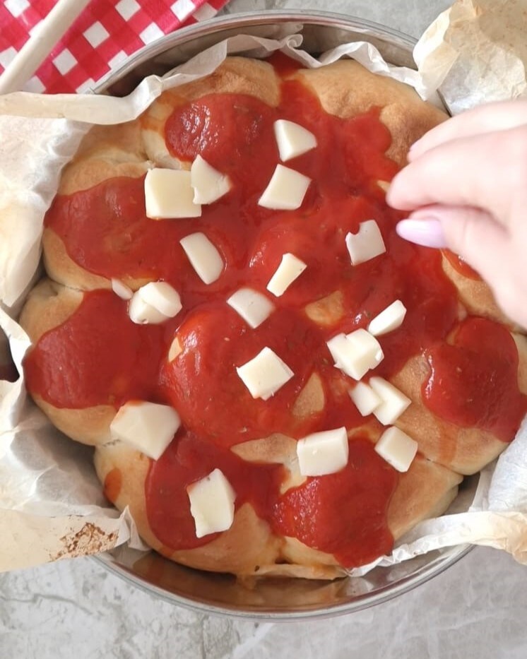 After the resting time, divide the dough into 10-11 balls of about 90 g each. When you open them, you must insert a teaspoon of tomato puree and diced scamorza cheese.