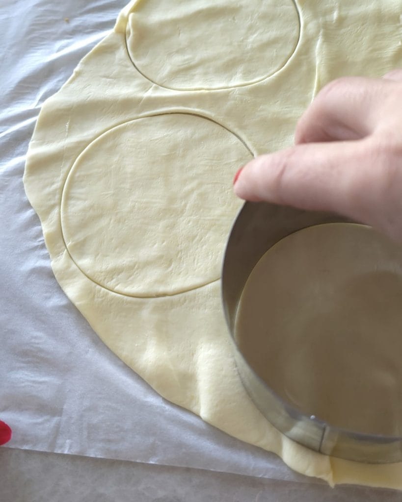 To prepare the Easter baskets, start by unrolling the puff pastry, then use a pastry cutter to cut it into six circles. With the remaining puff pastry, re-knead it and make six more. (you should get about 12 pieces in total).