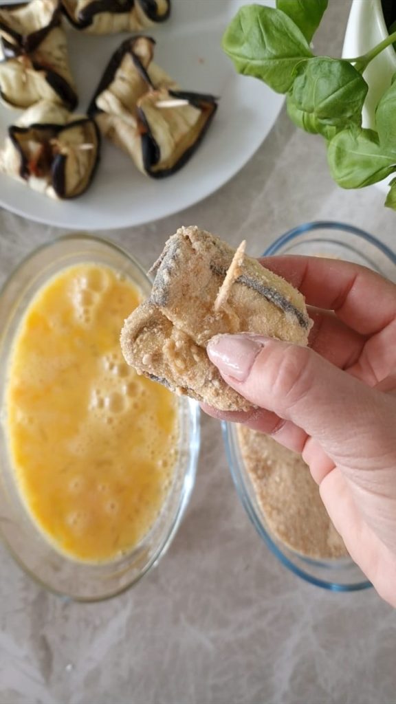 • At this point, dip the eggplant bundles first in the egg and then in the breadcrumbs.