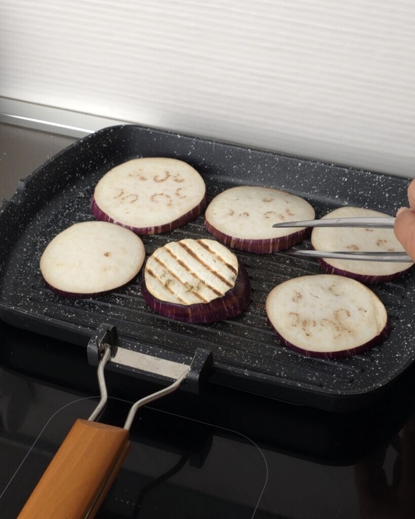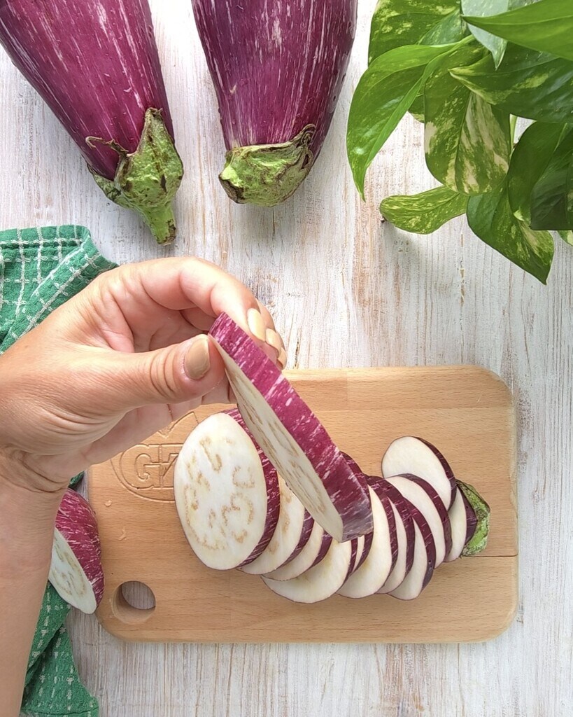 Wash and trim the eggplant, then cut it into slices about 3/4 inch thick. Let them purge for 10-20 minutes (optional, to remove bitterness), then dry them with a cloth.