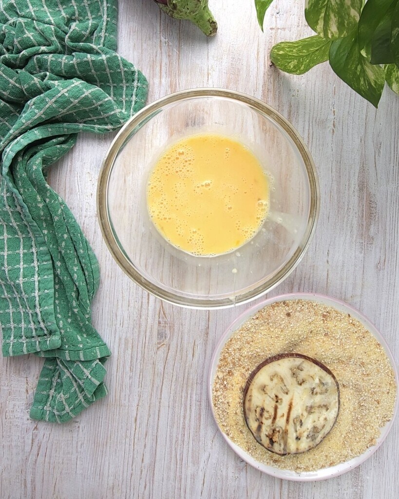 Then dip them in the beaten egg followed by the breadcrumbs.