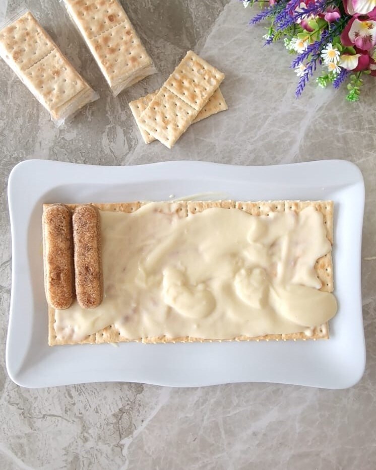 At this point, take a baking dish or serving plate. Arrange 9 crackers to create the base of the diplomat, then spread a couple of tablespoons of custard on top.