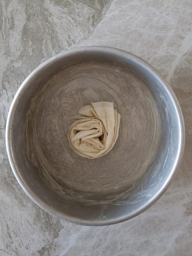 Phyllo dough takes its name from the Greek “phyllo” which means “leaf”. It is mostly made with flour, water, oil, and a pinch of salt. The dough is prepared and left to rest for 2 hours, then divided into equal parts to be rolled out with a rolling pin.