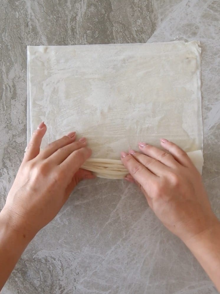 Place a second sheet of phyllo dough on top, making sure it adheres well.