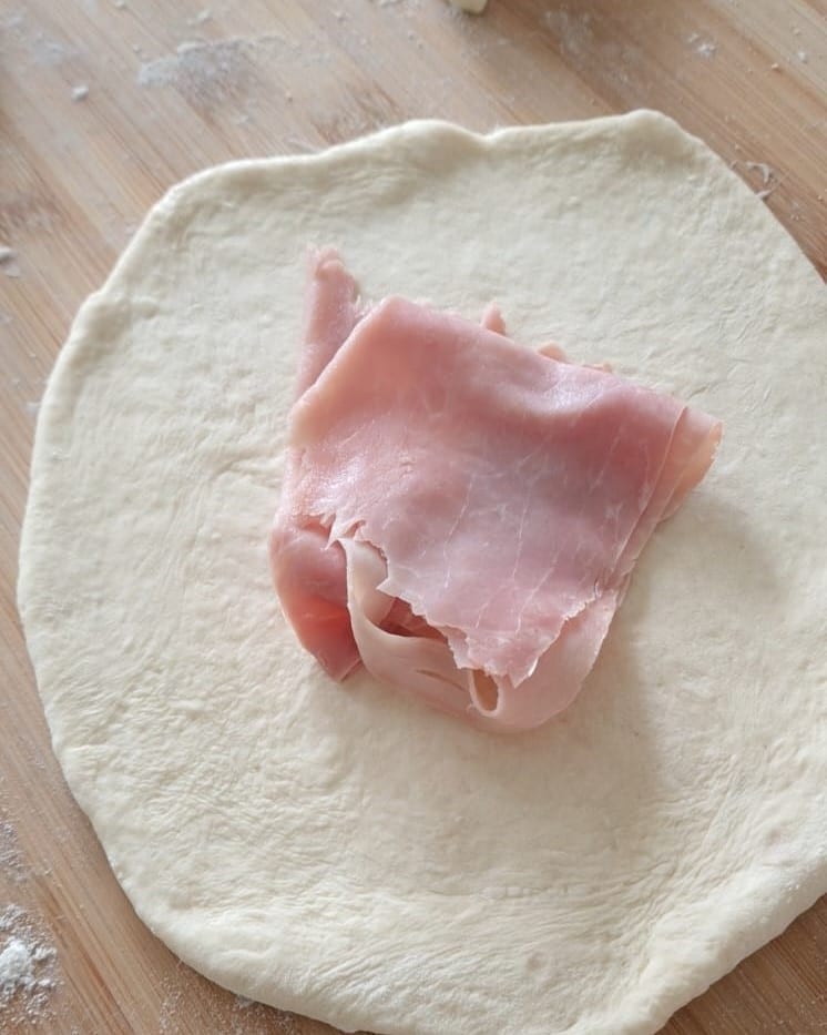 • After the rising time, transfer the dough to a floured surface and divide it into 7 pieces. Roll out each dough ball with a rolling pin, then add the cooked ham and sliced cheese.