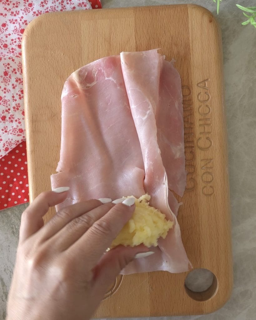 Lay out the ham slices on the work surface, and place some puree and a piece of cheese at the center of each slice.