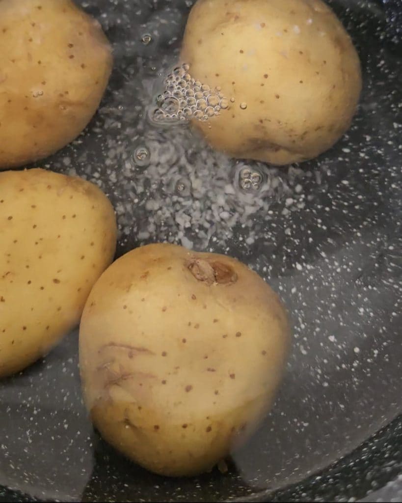 Boil the potatoes in salted cold water. Then peel and mash them with the skin in a bowl using a potato masher (don’t worry, the skin gets trapped inside).