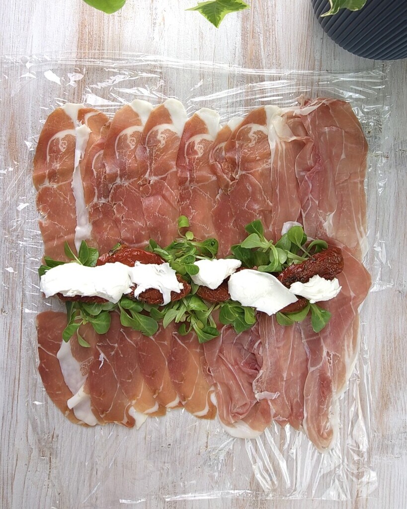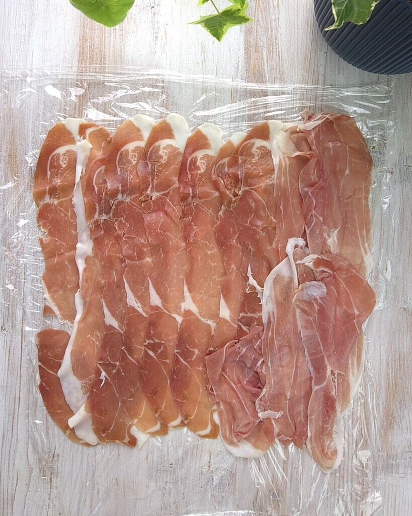 Arrange the slices of ham next to each other on a work surface covered with plastic wrap.