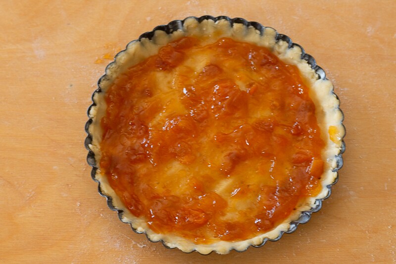 Then place the first disc in a tart mold of 8.66 inches, spread the jam, and then lay the sliced apples.