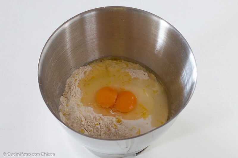 Continue by gradually incorporating the sifted flour and baking powder, then knead.