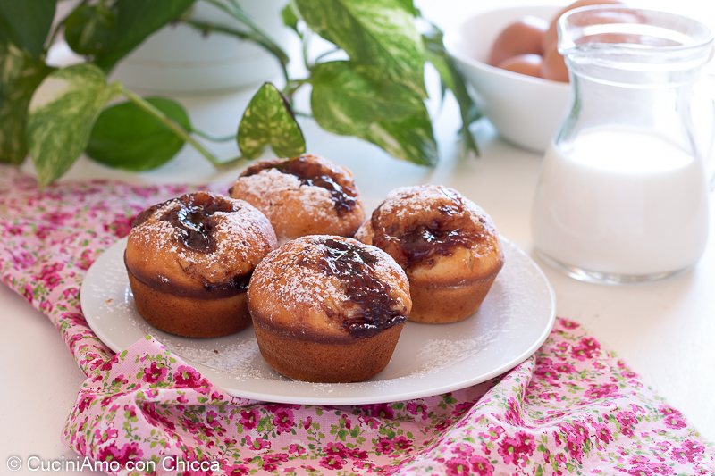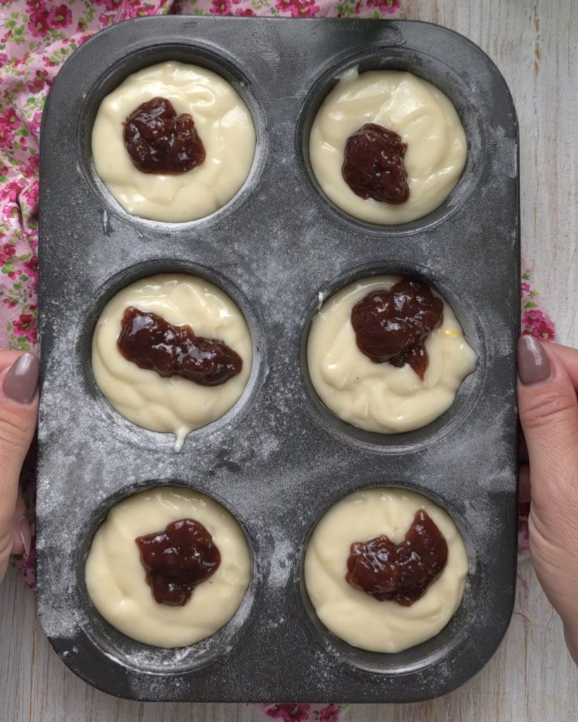 Then pour the mixture into the muffin molds, previously buttered and floured, add a generous tablespoon of jam on top.