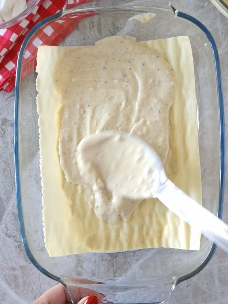 Place some bechamel on the bottom of a baking dish and start assembling everything, then lay the puff pastry, then add the crispy bacon and mozzarella cut into pieces.
