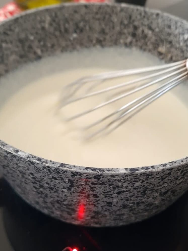 Then put it back on the heat and stir until it turns golden. Now that you’ve got the roux, add the hot milk and season with a sprinkle of nutmeg and a pinch of salt, then stir until it thickens, it will take about 10 minutes.