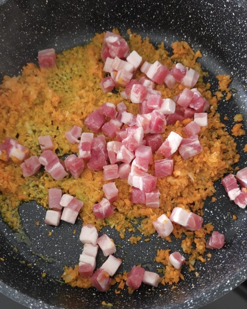 Add garlic and diced bacon, continue cooking over medium-high heat.