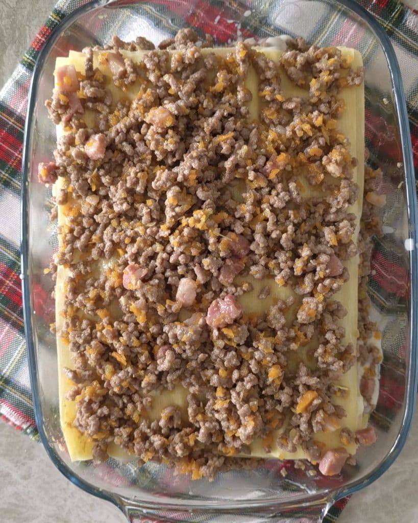 Place a little béchamel on the bottom with a spoon and then a layer of pasta, the sauce, and the mozzarella.