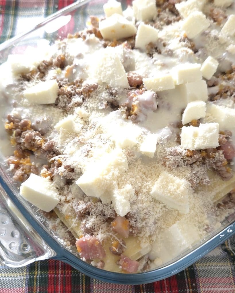 Form several layers, leaving the last one with a nice spoonful of béchamel, and a generous sprinkling of grated cheese.