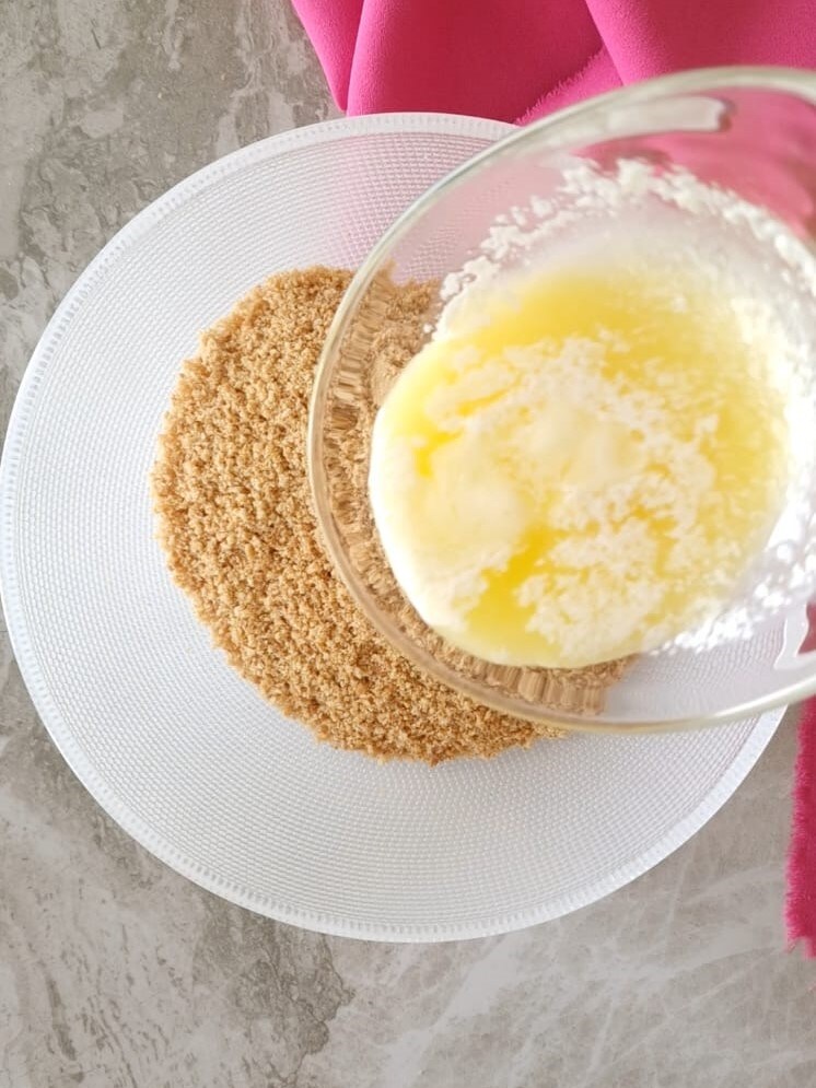 Start by crumbling the biscuits with a mixer, then add the melted butter and mix well.