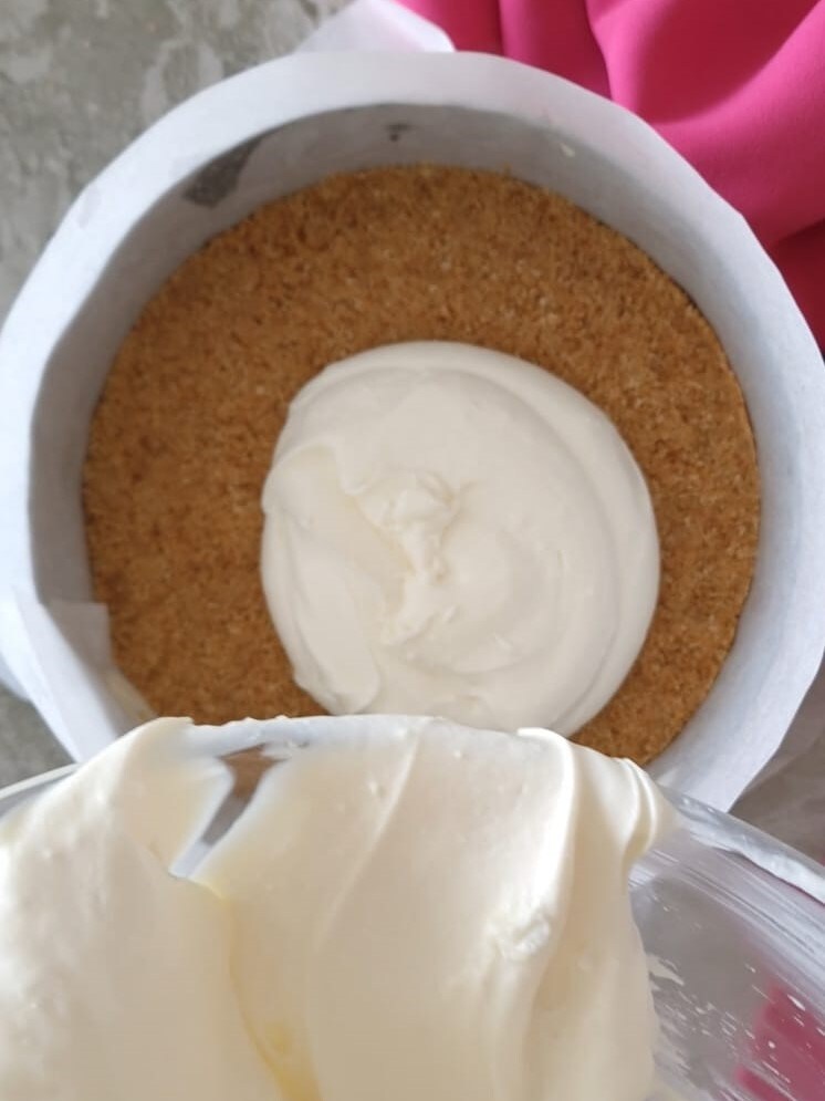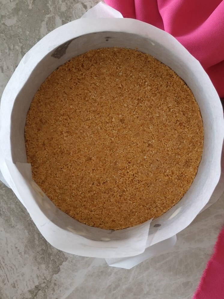 Pour the crumbled biscuits into the cake mold of 7-8 inches and with the help of a spoon, compact the mixture well to form your biscuit base, then let it rest in the freezer.