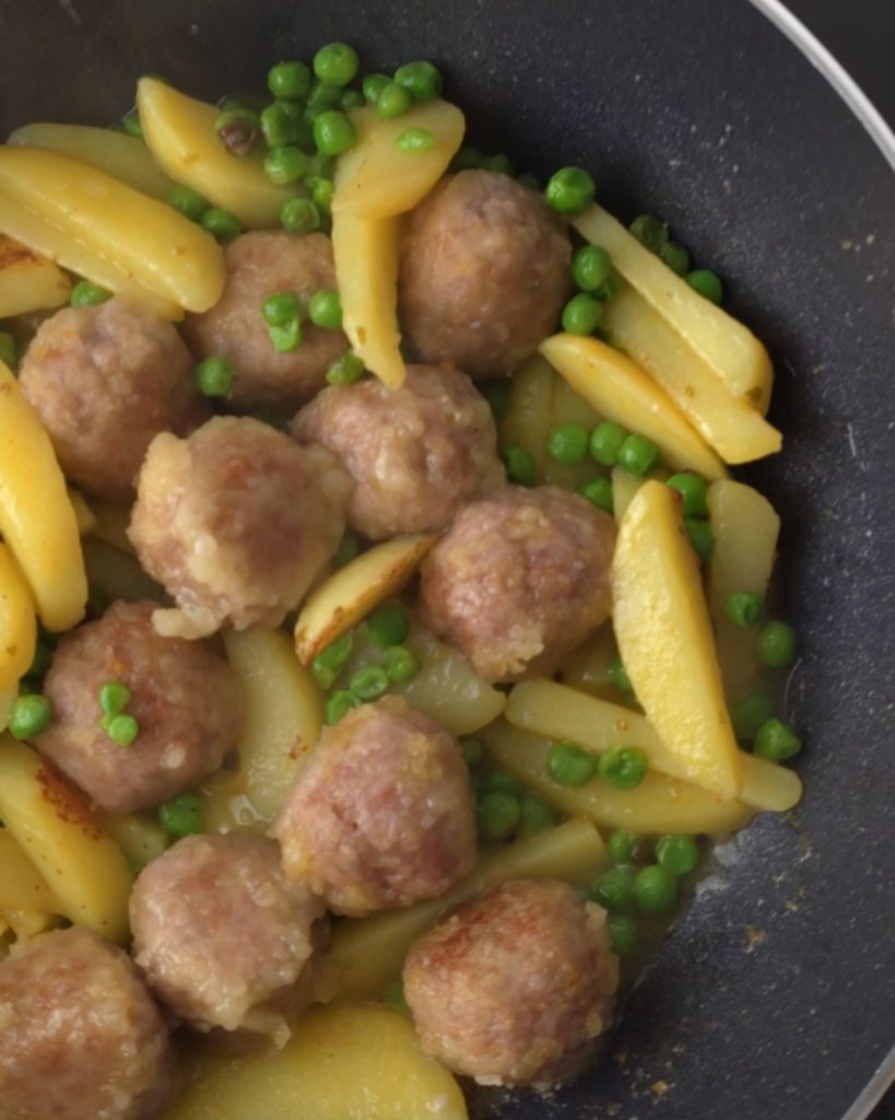 Once potatoes and peas are cooked, add the previously cooked meatballs, let them flavor well and serve at the table.