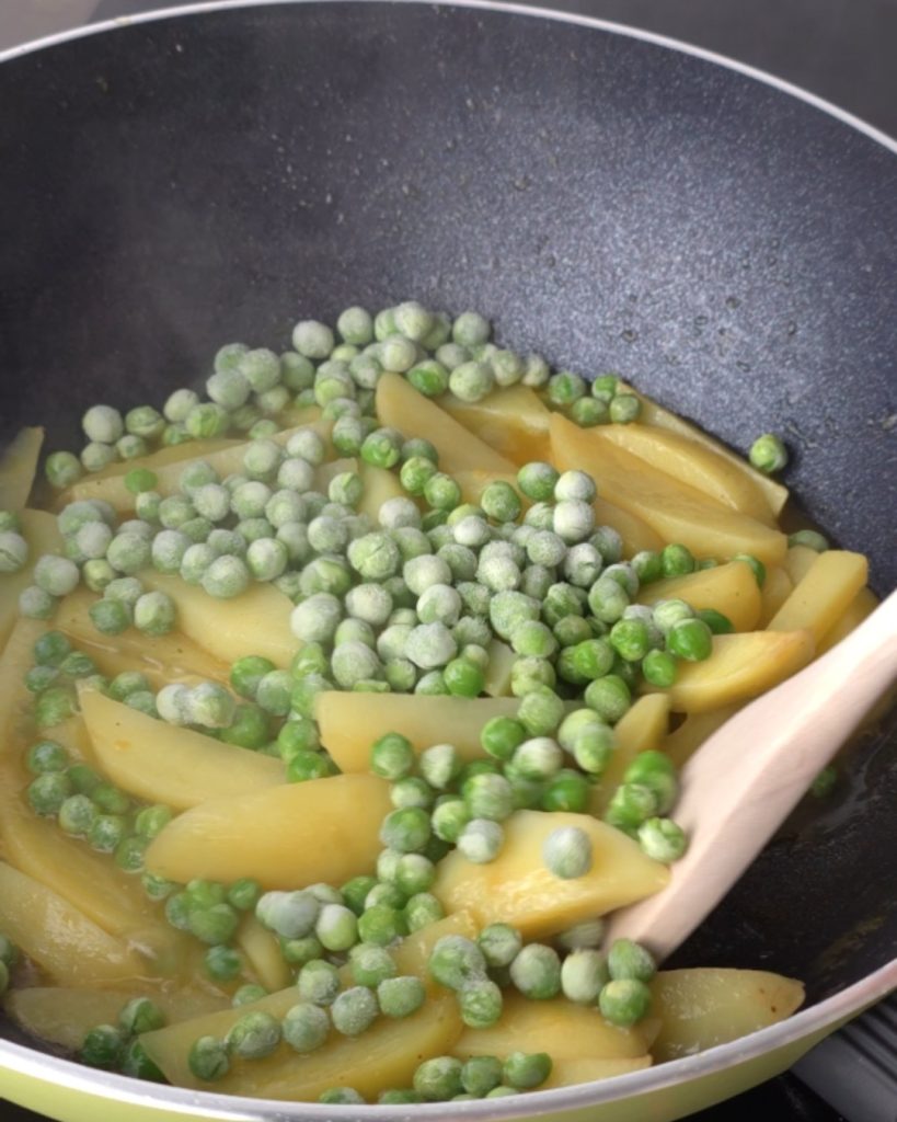 At the end of cooking, add the peas, adjust the salt and continue cooking for another 5-10 minutes.
