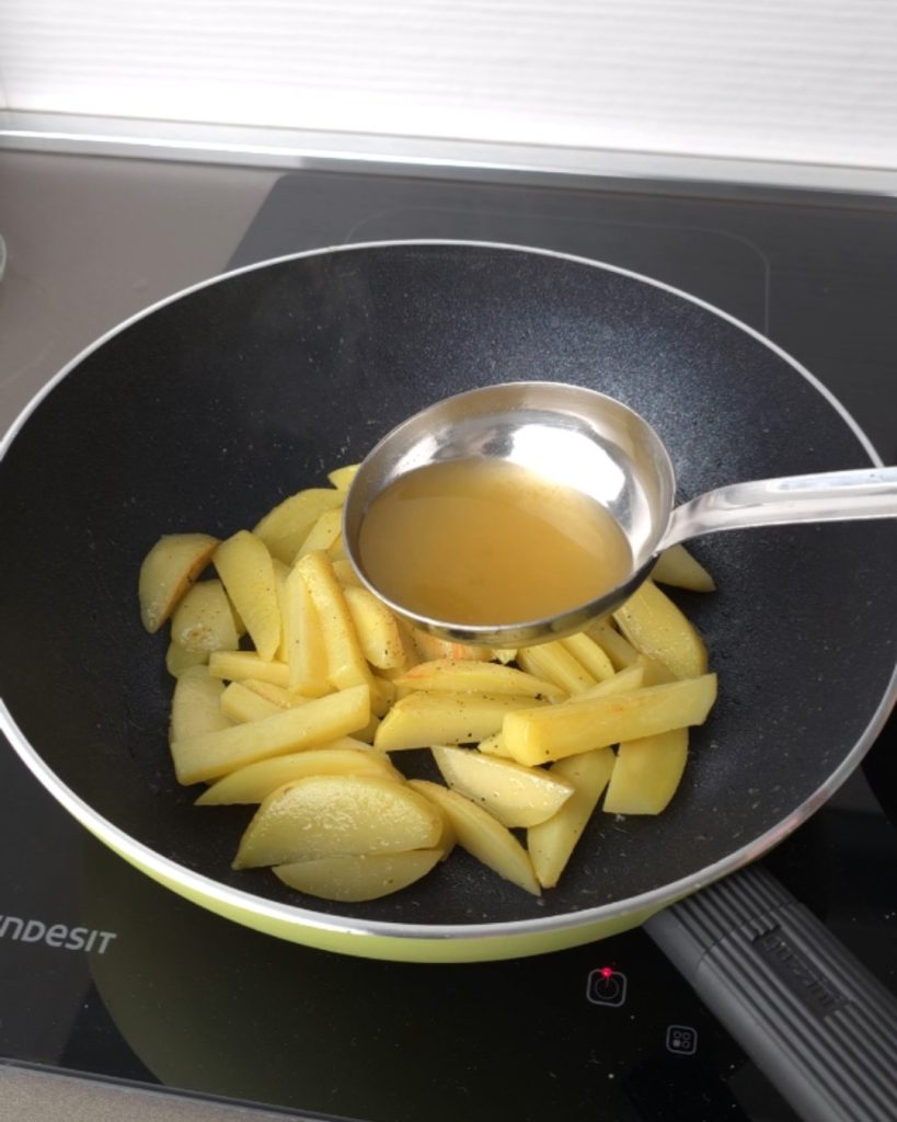 Cut the potatoes into wedges and brown them well in the pan, add salt, pepper, and garlic powder, add broth as needed.