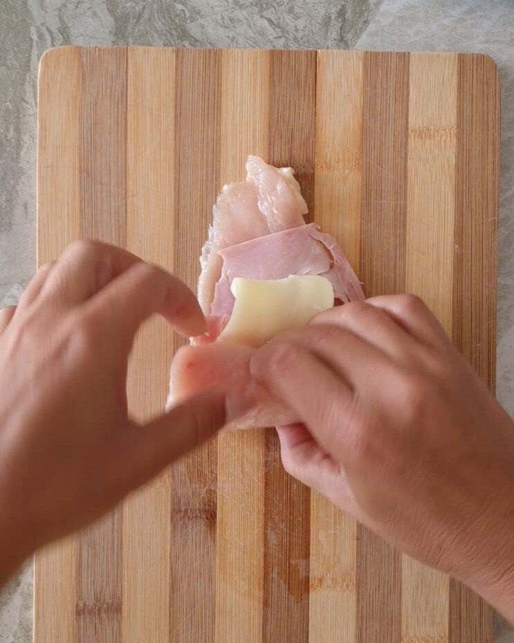 • Place the chicken breast slices on a cutting board, salt them, and add a slice of cooked ham to cover the entire chicken slice and a piece of cheese.