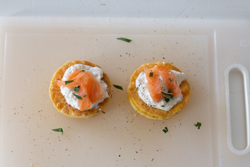 Garnish with a slice of salmon and fresh chopped parsley.