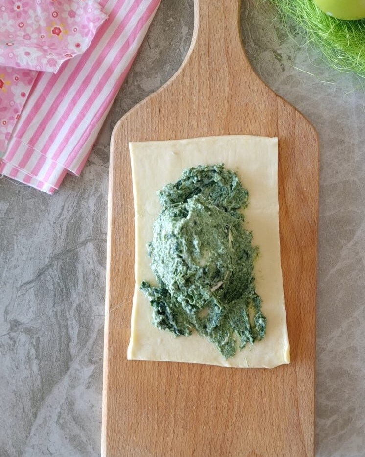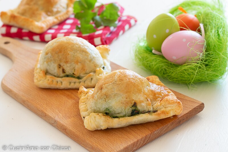 Mini Puff Pasqualina Pies, perfect to include in your Easter menu. Easy and quick recipe, and it is a variation of the classic Pasqualina pie. This savory pie has Ligurian origins, consisting of spinach, ricotta, and hard-boiled eggs, typically consumed during Easter. The mini Pasqualina puff pies are tasty and original, you can serve them as an appetizer, along with snacks with bacon and Philadelphia; you can prepare them well in advance and bake them just before serving. They are also perfect to bring to a picnic, accompanying them with the traditional Easter Cheese Bread or the Colomba Danubio with Nutella.