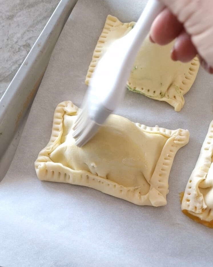 Brush all the mini puff Pasqualina pies with beaten egg and bake in the oven at 375°F for about 20 minutes or until golden brown.