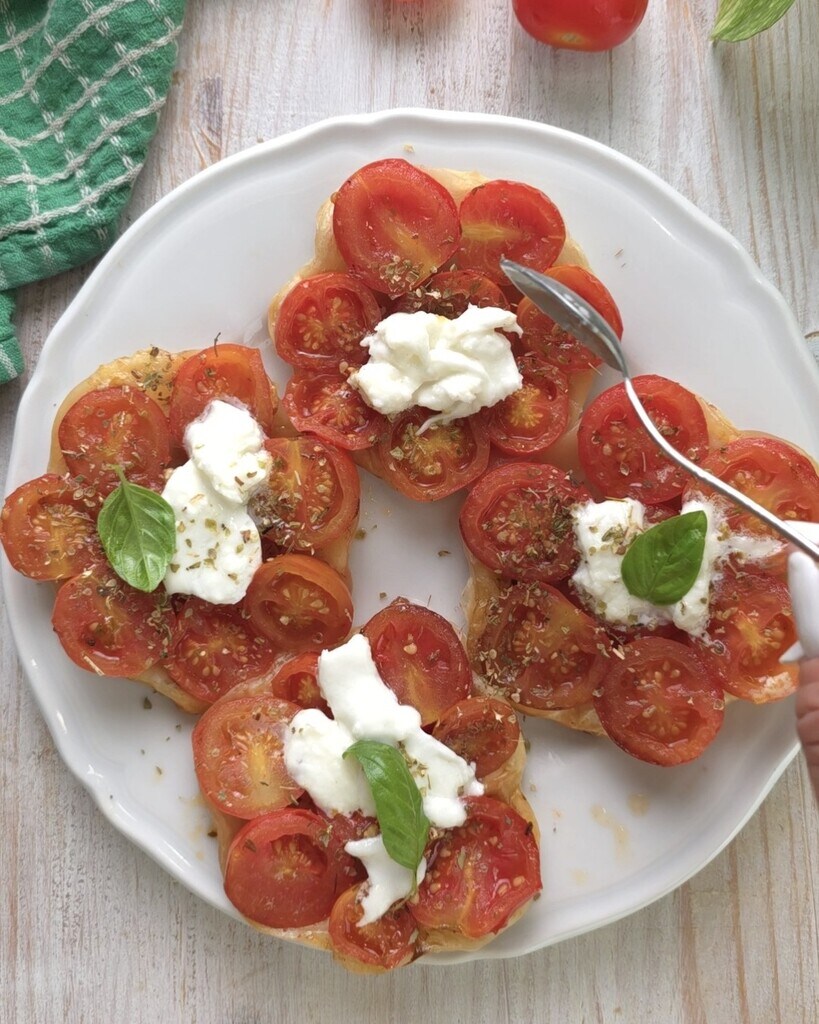 • Prick with a fork and bake in the oven at 375°F for about 12 minutes. Once baked, gently flip them over, and with the help of a spatula, transfer them to a serving plate. Complete the garnish with stracciatella or alternatively buffalo mozzarella and fresh basil.