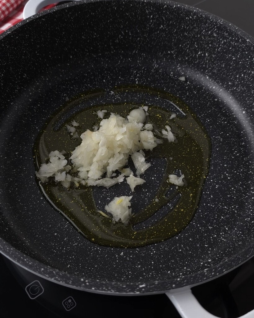 Meanwhile, sauté the chopped onion in a large pan with the oil. Add the peeled tomatoes, previously crushed or blended. Bring to a boil.