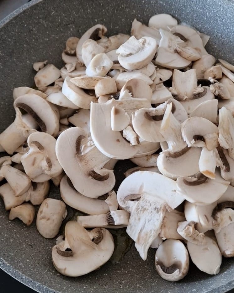 • Clean the mushrooms, slice them, then cook them in a pan with a splash of extra virgin olive oil and a clove of garlic.