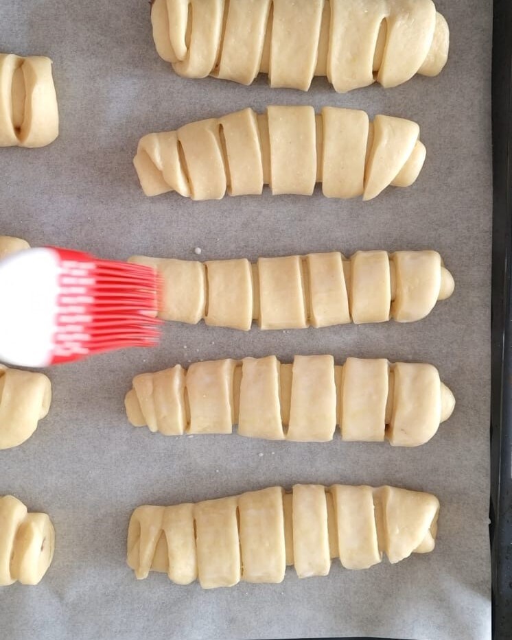 After the required time, divide the dough into 9 parts, roll each out with a rolling pin, and then fill with Nutella. Use a knife to make vertical cuts.