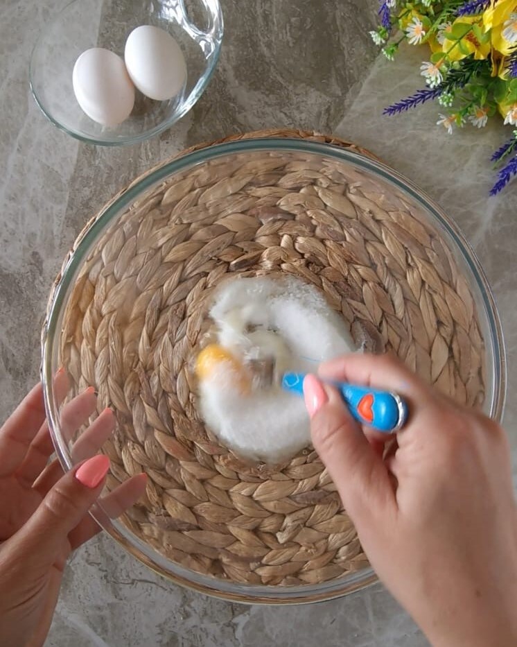 • Beat the eggs with a fork together with the sugar and vanillin or another flavor of your choice, then slowly pour in the oil.
